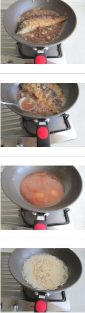 4. 汤汁加番茄酱、水淀粉煮开,收缩汤汁,再加入刚炸鱼的热油出锅,把汤汁浇在鲤鱼身上即可