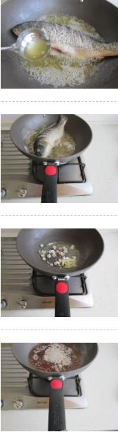 2. 坐锅倒油烧热倒6成,下鲤鱼连续上火几次,用勺子不停的往鲤鱼身上浇热油,待鱼浸透油后,再上大火,油温升高后,捞出鱼沥油