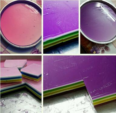 2.千层糕主要是用椰汁和透明层分开而成! 透明层:将5克鱼胶粉加少许热水搞拌至无颗粒,再加入100克水20克糖(糖可以根据个人口味添加),加入自己喜欢的色素(三四滴)搞拌,将搞拌好的液体倒入模具,放入雪柜冷藏10分钟,待溶液凝固后取出加入一碗椰浆放雪柜冷藏10分钟后再加入下一层透明层(每层颜色约需10分钟)如此类推即可.