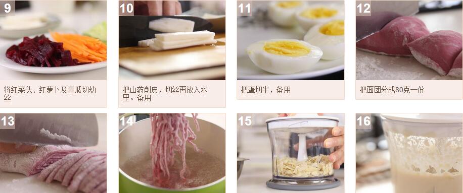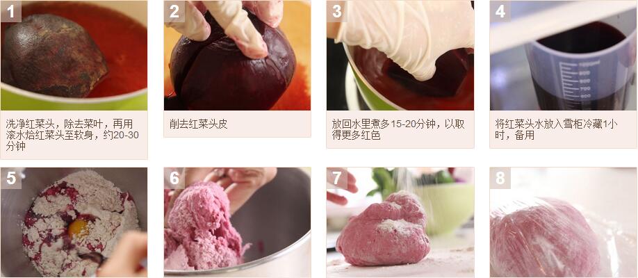 面条材料:中筋面粉2杯,盐¼茶匙,蛋1只,红菜头汁160毫升