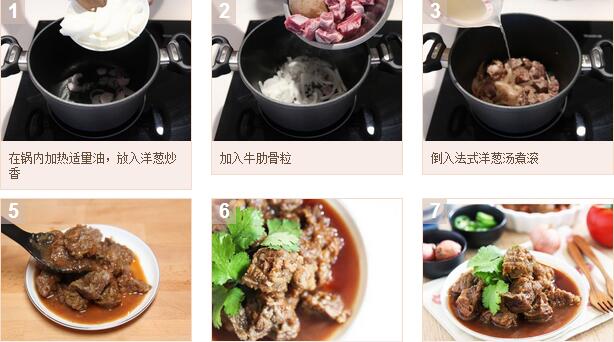 洋葱焖牛肋骨的材料:牛肋骨2斤,,洋葱2颗,法式洋葱汤2罐 洋葱焖牛肋骨的做法: 1.在锅内加热适量油,放入洋葱炒香;加入牛肋骨粒,煎至呈金棕色; 2.倒入法式洋葱汤煮滚,之后转为小火,炖煮至骨肉分离再撇去浮在汤面上的多余油分就可以装盘上桌了。