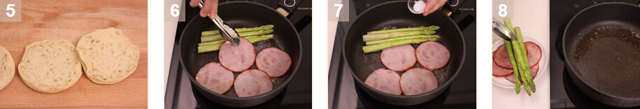 7. 将松饼放入多士炉烤焗,或于煎锅内烤焗。先把熏猪肉及芦笋放在已烤好的松饼上,然后放上水波蛋,荷兰酱淋上面。洒上芫茜碎,并以盐及胡椒粉调味就可以吃了