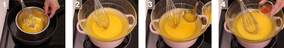 2. 将蛋黄、柠檬汁及盐加入搅拌碗内,打发均匀后倒进碗内,放入双层蒸锅,把水加热慢慢煮,然后慢慢加入热溶了的牛油,并与蛋黄混和直至酱汁浓稠。加入少许辣椒汁拌匀,放在一旁备用