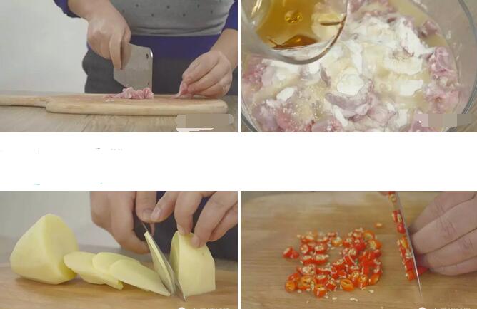 1.将新鲜的兔肉切成小块,然后放入淀粉、盐、鸡精、料酒和匀,腌制10分钟。