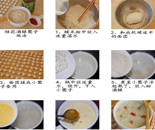 荔枝酒酿圆子的材料:荔枝、银耳、枸杞、酒酿、核桃、糯米粉、鸡蛋;盐、冰糖; 荔枝酒酿圆子的制作: 1.把银耳、适量的盐、冰糖、枸杞和酒酿放到锅里煮开,开锅后改成中小火, 2.将糯米粉和清水调好之后搓成小球,扔到锅里,然后放荔枝肉、核桃仁和蛋花,关火盛出即可出锅。