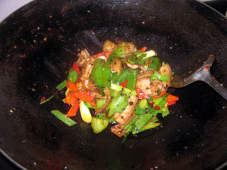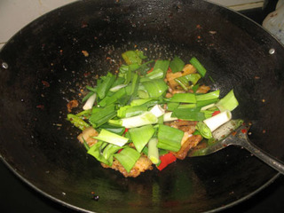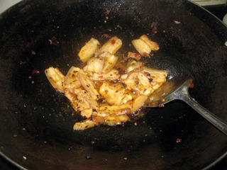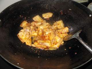 6 待肉片出油有点卷的时候,下郫县豆瓣酱炒匀