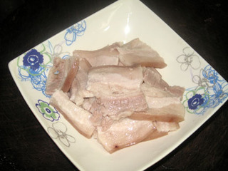 3 冷水下肉,大火烧开,煮至肉刚熟即可,待肉凉后切成薄片。