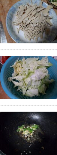 白菜豆腐丝的材料:包菜小半个,豆腐丝400克,油,盐 白菜豆腐丝的做法: 1.豆腐丝洗净直接切成段,小半个包菜切块 2.坐锅倒油下葱花和蒜末炝锅,放入包菜,再放入豆腐丝,加入1勺食盐,翻炒均匀断生即可出锅