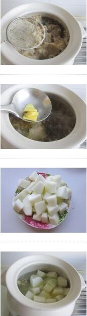 2. 土鸡凉水下煲里,大火烧开,转小火,撇去浮沫,加姜片、料酒小火炖1小时