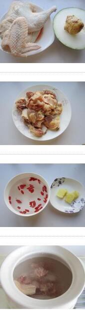 冬瓜炖土鸡的材料:冬瓜300克,土鸡半只,盐,枸杞30个,姜5克,料酒2 茶勺,