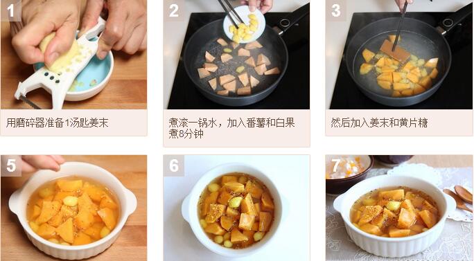 桂花白果番薯糖水的材料:番薯350克,白果20克,姜20克,黄片糖80克,桂花5克,水1L 桂花白果番薯糖水的做法: 1. 番薯去皮,切成中等大小的块。用磨碎器准备1汤匙姜末。 2. 煮滚一锅水,加入番薯和白果煮8分钟,然后加入酱汁和黄片糖,继续煮至糖完全融化,盛入碗中,吃之前加上桂花就好了。
