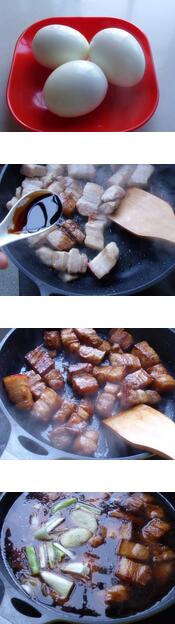 1.五花肉洗净,切小块,葱切段,姜切片,煮好并剥掉蛋壳的三个鸡蛋