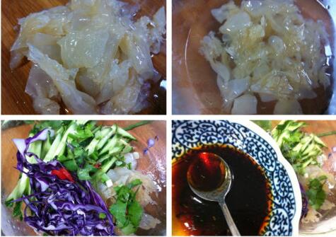 1:海蜇头清洗干净,浸泡8小时以上,在浸泡的时候至少要换水2-3次