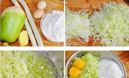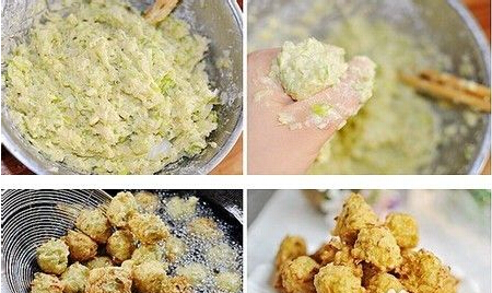干炸萝卜丸子的材料:青萝卜1个、鸡蛋2个、大葱白2根、普通面粉、盐、十三香、植物油各适量。 干炸萝卜丸子的做法: 1.新鲜青萝卜洗净,用擦子将萝卜擦成丝,擦好丝的萝卜用刀剁一剁,不需要太碎。葱切成末。 2.萝卜丁和葱末放入盆子里,加入一勺盐拌匀腌约10分钟左右,会腌出很多水分,用手挤去萝卜多余的水。 3.姜剁成末,挤过水分的萝卜丁、鸡蛋、盐、十三香、面粉一起放入盆里拌匀,萝卜可以成团即可。 4.油锅烧到6成热,一手抓起萝卜馅,捏成拳头状,将馅从虎口挤出丸子形,下入丸子,中火慢炸至表面金黄即可。