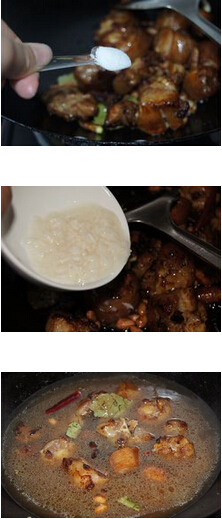 花生焖猪尾的材料:猪尾 (一只),花生,姜蒜,盐,八角,辣椒,香叶,米酒,清水,鸡精 花生焖猪尾的做法: 1.猪尾洗净斩块。 2.锅里放油,炒糖色,然后放入猪尾炒均,放入姜蒜炒香,接着放入花生翻炒片刻,放入香叶 八角 辣椒炒香,放入适量的盐炒均,放入一小碗米酒炒均,最后放入清水煮至收汁,放入鸡精调味即可。 的做法