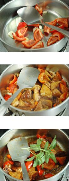 三杯豆腐的材料:豆腐,红柿子椒,鲜罗勒 三杯豆腐的做法: 1.将豆腐洗净沥干对角切开,锅里加少许油加热后将豆腐煎至两面金黄。 2.红柿子椒洗净切成菱形块,蒜粒拍松。 怎么做好吃 .碗里加入米酒、生抽、香油调匀,制成料汁。 4.锅里留少许底油爆香姜片和蒜粒,加入红柿子椒片,倒入豆腐和料汁翻炒均匀,加入鲜罗勒,调入盐、白砂糖拌炒均匀即可。