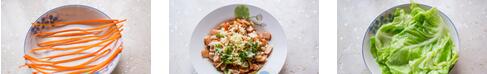 1.在卷心菜根部切一刀,然后将叶子一片片摘下,将白色的硬根去掉,然后清洗干净备用,香菜、姜切末备用,胡萝卜去皮,削成条,放到盐水里面杀一下水,这样就会像绳子一样好用。