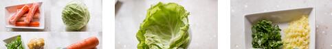 3.汆烫卷心菜:锅中水烧开,水中加1小勺盐,将卷心菜放入水中汆烫至软,然后捞出过凉水。