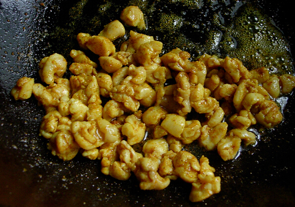 咖喱鸡丁炒饭的材料:鸡肉,米饭,玉米粒,豌豆粒,咖喱粉,盐 咖喱鸡丁炒饭的做法: 1、鸡肉洗净切成小丁, 2、做锅倒油,油烧至六七成热时放入咖喱粉略炒(注意:为防止枯焦,火关小或者离火炒)后放鸡丁,然后放玉米粒、豌豆粒、米饭(最好是冷藏过的隔夜的米饭,大火颠炒,略调盐即可。