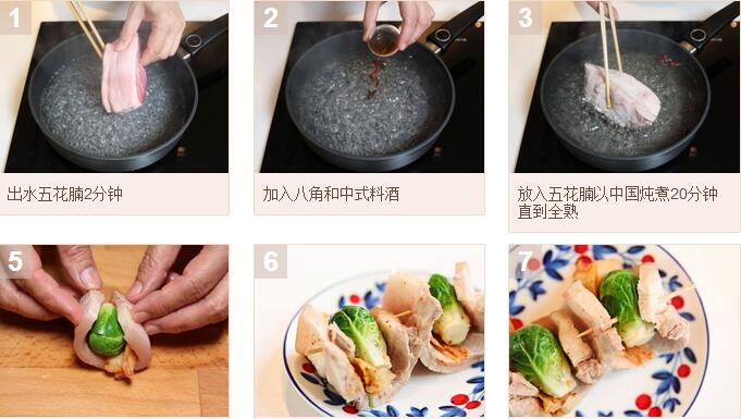 一口泡菜五花腩卷的材料:五花腩200克,球状甘蓝200克,泡菜100克,中式料酒1汤匙,八角