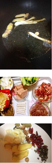 2.坐锅倒油烧热,放入葱白、姜片炸出葱香油后捞出葱白姜片后,再加入火锅底料150克炒香,放入佐料小火继续翻炒,在炒制过程中如果有醪糟加一勺进去更加提味
