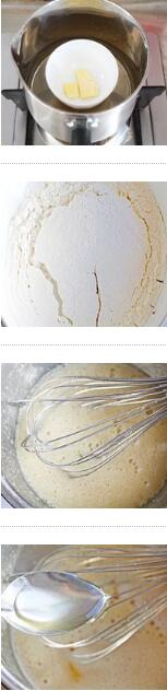 1. 黄油放入小碗中,隔热水小火加热至融化,将低筋面粉过筛。