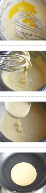 4. 取一个不粘锅,小火,预热一会儿后舀一勺面糊入锅中心,当面饼表面出现一些小孔,翻面煎,翻面再煎30秒左右,视底部中间颜色略深即盛出。
