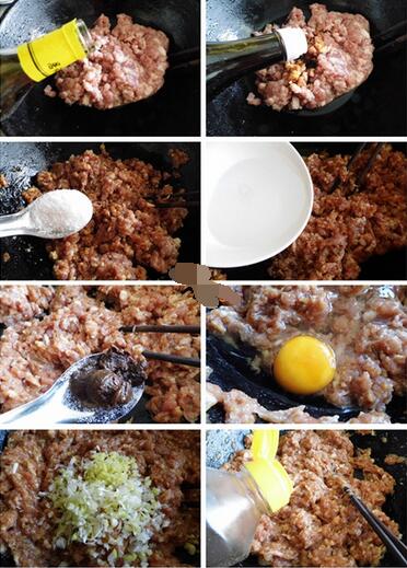 1、肥瘦相间猪肉馅加入料酒,生抽,盐,一点白水搅拌,让水吃到肉馅中,一勺的黄酱,一个鸡蛋,葱姜末,搅拌均匀,在肉馅上劲后,最后加入一点香油,备用