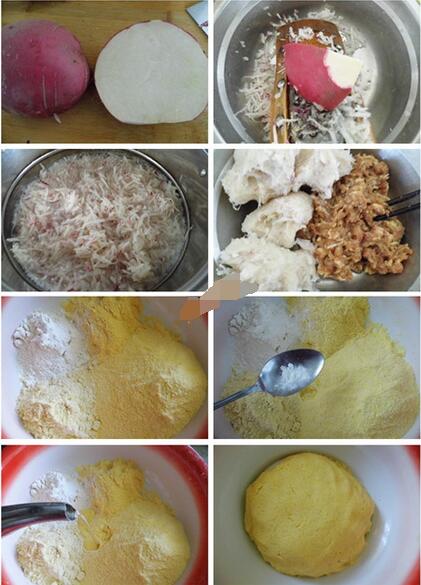 萝卜馅菜团子的材料:肥瘦相间猪肉,生抽,盐,白水,鸡蛋,黄酱,葱姜末,香油,大红袍萝卜,粗玉米面,黄豆面,白面,细玉米面,小苏打