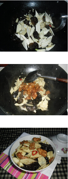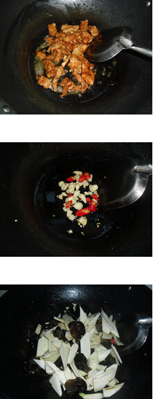 黑木耳茭白炒肉的材料:茭白,黑木耳,瘦肉,蒜,小红椒,酱油,生粉,料酒,鸡精,油盐 美食网