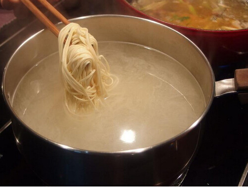 4、煮滚高汤的同时,另一锅的热水沸腾时,面条也可以下锅开始汆烫。
