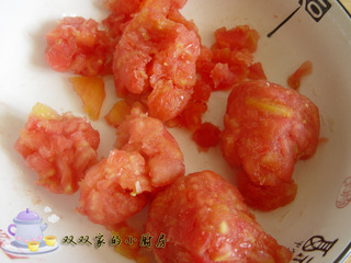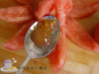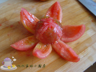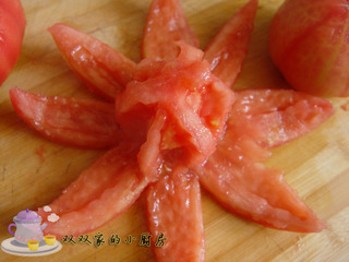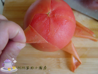 1 西红柿顶部用刀子切割十字口。锅子烧开水,投入,30秒,捞出。扒皮。