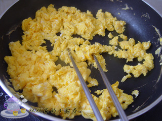 10 鸡蛋打散。平底锅烧热,倒油,将鸡蛋倒入,用筷子快速搅拌,待鸡蛋凝固快速倒出。摊开,凉凉。要是还嫌大,就切小点。