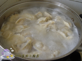 17 锅子烧开水,将饺子放入,用勺子背沿锅沿轻推,防止粘连。将饺子煮至饺子浮起,肚子鼓起即可。因为饺子是素馅,所以易熟。
