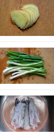 1.姜片洗净,切片待用,葱段洗净,切成小段,,猪手去除杂毛,洗净备用