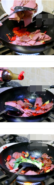 回锅牛肉的材料:卤牛肉,红椒,大蒜叶,生姜,干尖椒,盐,老抽,鸡精,胡椒粉 回锅牛肉的做法: 1. 卤牛肉切片,红椒切大丁,生姜切片,大蒜叶切长段,干尖椒剪好备用 2. 炒锅倒适量油,下入姜片,干尖椒,红椒,加小半勺盐,炒香,下入牛肉翻炒,加少量老抽,鸡精,胡椒粉,少量水,翻炒均匀,最后加入蒜叶,翻炒几下即可出锅了