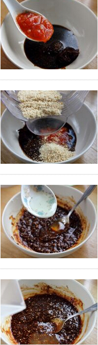 自制烧烤酱的材料:花生仁15克,白芝麻5克,黄豆酱1小勺,老抽1汤勺,生抽1汤勺,食物油1汤勺,精盐1/2小勺,番茄酱1汤勺,五香粉1/3小勺,孜然粉1/4小勺,糖2小勺,生姜粉1/4小勺,水
