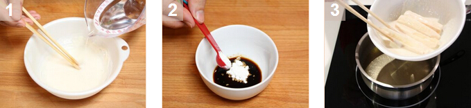 3. 在另一个碗中将酱油,糖,醋和生粉混合。