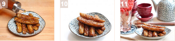 5. 在另外一个锅中加热适量油,加入糖醋酱汁,用中火煮至酱汁浓稠,加入莲藕条,混合均匀,再撒上适量芝麻就可以了。