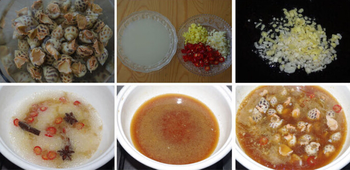 辣酒煮花螺的材料:花螺500g、姜、蒜、鲜红椒、葱、八角、桂皮、鱼露、盐、生抽、胡椒粉、生抽、甜酒汁、白酒、陈醋 辣酒煮花螺的做法: 1、新鲜的花螺,用小刷子把外壳刷干净,用盐水泡二十分钟,然后沥干水备用 2、姜、蒜切末、鲜红椒切小圈,甜酒汁和白酒以2:1的比例总成酒汁 3、锅子热油,小火将姜末、蒜末、一半的红椒圈炒香 4、加入一小碗水,再放入八角和桂皮煮开,小火煮十分钟 5、加入酒汁、鱼露、陈醋和剩下的红椒圈烧开,然后放入花螺煮四、五分钟即可,出锅前加盐、生抽、胡椒粉调味,撒葱花即可。