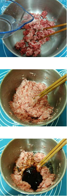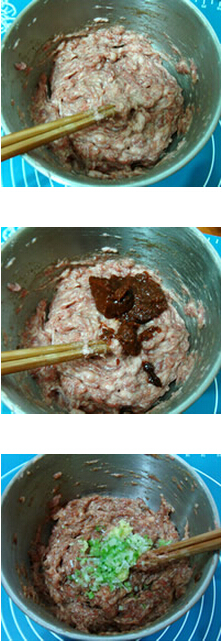 2.肉馅分三次加入100g水,搅拌至肉馅完全吸收水分,加入生抽、料酒、蚝油,搅拌均匀。再加入豆瓣酱搅拌均匀,加入葱末姜末搅拌均匀。最后加入一勺香油拌匀即可。