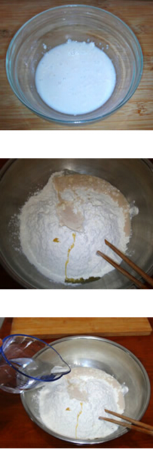 1 酵母加入适量温水里搅拌均匀,把酵母水及油加入面粉中,分次加入220g水,边加边用筷子搅拌,直至没有干粉,呈絮状,揉成光滑面团,盖上保鲜膜 ,室温发酵40分钟左右。