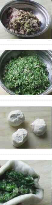 4. 这时候面也醒好了,这时候的面很好上手,揪成一个个大小适中的剂子,用手掌把皮按好,用手兜住面团放馅,把馅往里压,收口,这样出来就是薄皮大馅啦.收好口后用手在案板上按成饼状,即可下锅烙饼,如果用的是电饼档,两面差不多八分钟却可。