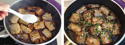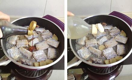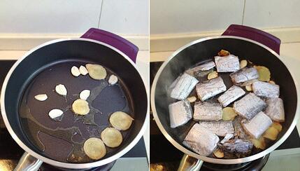 2.平底不粘锅烧热,倒少许油,下如蒜姜片煎出香味,下入带鱼段,开大火煎至两面金黄(煎好一面再煎另一面,不要反复翻动)喷入适量料酒,倒入适量酱油和米醋(我这里大概放了10克料酒,40克酱油,30克米醋),再加入50克热开水,开大火煮带鱼,摇动几下锅子,撒上一层白砂糖(大概15克)用筷子或者铲子将带鱼每个都轻翻一下面,再次晃动锅子,使带鱼整个包裹上糖醋汁,见到汤汁变很浓稠,关火,撒上葱花,出锅装盘