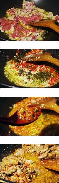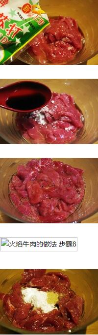 火焰牛肉的材料:牛肉250克,姜蒜,香菜,苏打粉半勺,料酒6勺,蛋清1个,淀粉2勺,胡椒半勺,生抽1勺,盐,小米辣,剁椒,美食网火焰牛肉的做法1 牛肉洗净控干水分,逆纹切薄片,放入碗中加料酒5-6勺,鸡蛋清一个,小苏打小半勺,生抽1勺用筷子搅匀后腌制半小时。2 小米辣 姜 蒜 香菜分别切碎 美食网3 牛肉腌制半小时后,加入淀粉2勺,再加入,盐、胡椒粉拌匀上浆。4 坐锅倒油烧热下入牛肉快速翻炒变色盛盘备用。5 锅中留底油,放入辣椒 姜蒜 花椒小火炒香,放入滑过油的牛肉片翻炒均匀,加入,盐调味起锅,撒上香菜就好了