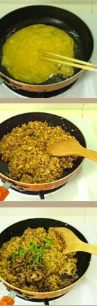 青椒肉丝蛋炒饭的材料:青椒1个,鸡蛋2个,肉丝100克,姜两片,米饭2碗,酱油,糖、鸡精各适量。青椒肉丝蛋炒饭的做法:1、青椒切丝,鸡蛋打散;2、肉丝放入碗中加鸡精、少许酱油、糖拌匀,再加少量油拌匀。 的做法3、坐锅倒油烧三成热时,放入青椒大火迅速翻炒变色后盛起备用;4、原锅留底油,将肉丝放入,大火迅速翻炒到变色后,盛起备用;5、原锅留底油,倒入蛋液,用筷子迅速划散后立即下入米饭,并倒入适量酱油中小火炒匀倒入炒好的青椒、肉丝,炒匀即可起锅。家常菜谱