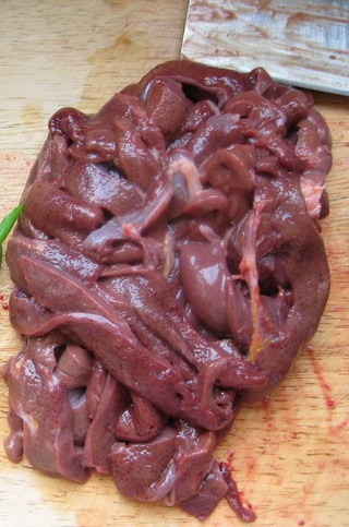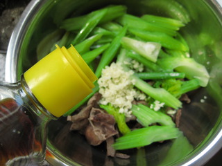 5 将芹菜与猪肝加酱油、香油、醋、盐(少许)、蒜末、红辣椒粒拌匀即可。