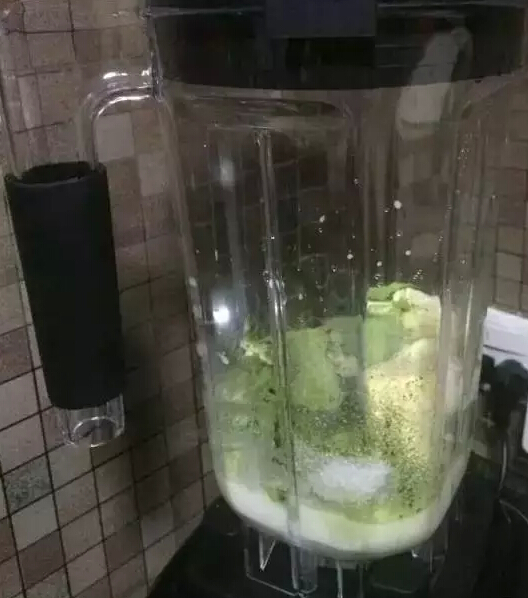 2.料理机裡依次加入冰、雪糕、牛奶、糖、抹茶粉、香草油,开机,打大概90秒,直到把冰块打成沙冰的状态!