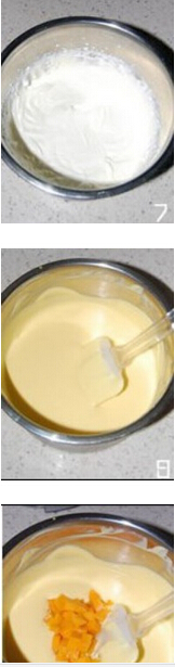 5.淡奶加细砂糖打发至6,7分发(芒果本身有甜度,糖的量可以自由调节),打发的淡奶和芒果酱混合均匀即成慕斯糊,芒果丁到入慕斯糊拌匀