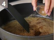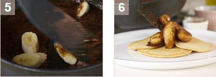 4.以中火熔化牛油,黄糖,玉桂,豆蔻及枫树糖浆至完全熔化及搅匀成酱汁,加入切片的香蕉,并混入酱汁,混入兰姆酒,然后将香蕉及酱汁放于班戟上再撒上喜欢的果仁就可以开吃了!